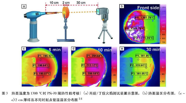在復合氣凝膠研究方面,主要包括兩種策略:一種是在Si02氣凝膠中引入其他氧化物氣凝膠,形成一種二元或三元氣凝膠,抑制氣凝膠的燒結以及晶粒的長大;另外一 種就是與有機基體復合,形成一種有機無機雜化氣凝膠, :然后經過后續的碳化、碳熱還原等過程形成一.種Si-0-C氣凝膠材料。Hou等的通過快速凝膠法制備了纖維增強Si02 ZrO2復合氣凝膠,熱導率低至0.0235 W/(m.K),抗壓強度高達0.82 MPa。Wu等 制備的Al20-Si02氣凝膠(圖2)經1200℃熱處理后比表面積高達166 m2 lg,顯著提高了Si02氣凝膠的耐溫性能。Yu等D3以酚醛樹脂作為網絡結構增強體與Si02 氣凝膠進行同步聚合,制備的有機無機雜化氣凝膠(厚度20 mm)在經過1300℃熱考核20 min后,背溫僅為300℃,同時材料正反面在30 min考核后都保持結構完整(圖3),這對于混凝土結 構高層建筑的防火逃生具備重大意義。趙楠等味制備的莫來石纖維增強Si-0-C氣凝膠在1000℃下的熱導率低至0.043 W1(m. K),同時經1000 C熱煅燒之后沒有發生任何收縮。Assefa等 19以聚二甲硅氧烷和四甲基乙烯基環四硅氧烷為原料,經1200℃惰性氛圍熱處理制備了Si-0-C氣凝膠,該材料比表面積為530 m21g,孔體積為0.649 cm3/g。Ma等制備的Si-0-C氣凝膠比表面積位于365 ~488 m21g,表觀密度位于0.265 ~ 0.335 g/cm ,抗壓強度較高可達3.17 MPa。